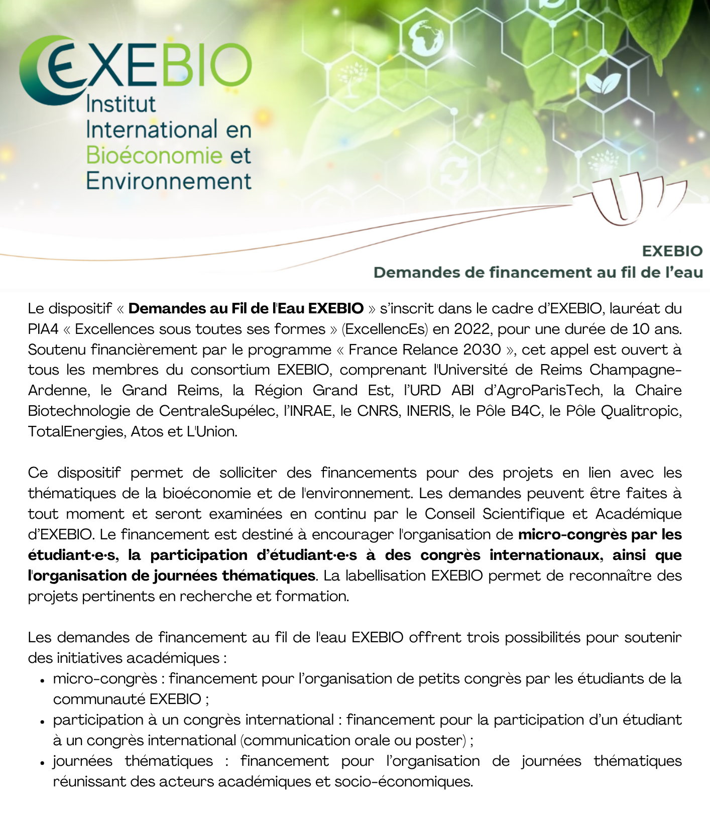 Financement pour l’organisation de petits congrès par les étudiants·tes (niveau Master ou Doctorat) de la communauté EXEBIO.