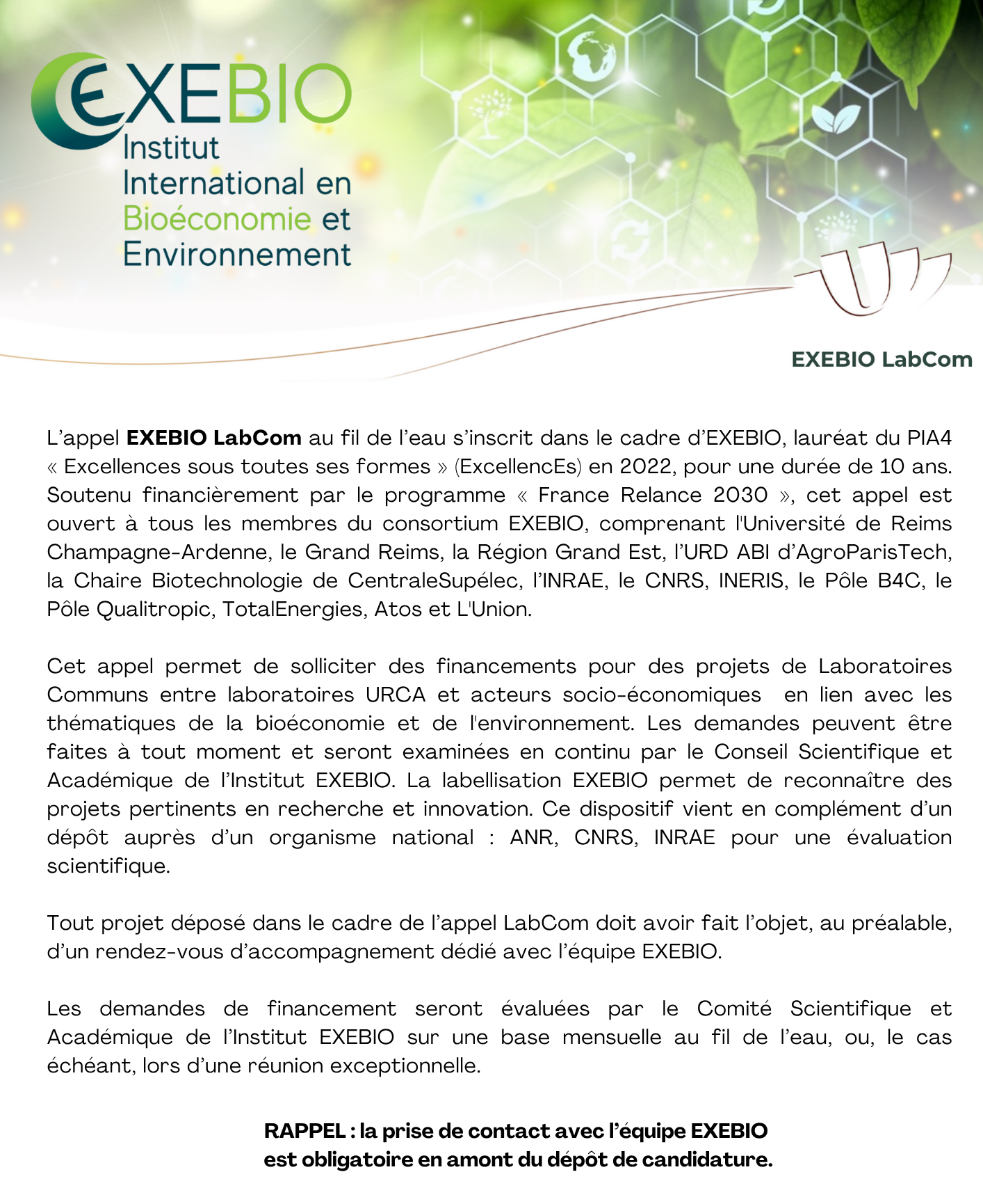 L’appel EXEBIO LabCom au fil de l’eau permet de solliciter des financements pour des projets de Laboratoires Communs entre laboratoires URCA et acteurs socio-économiques en lien avec les thématiques de la bioéconomie et de l'environnement.